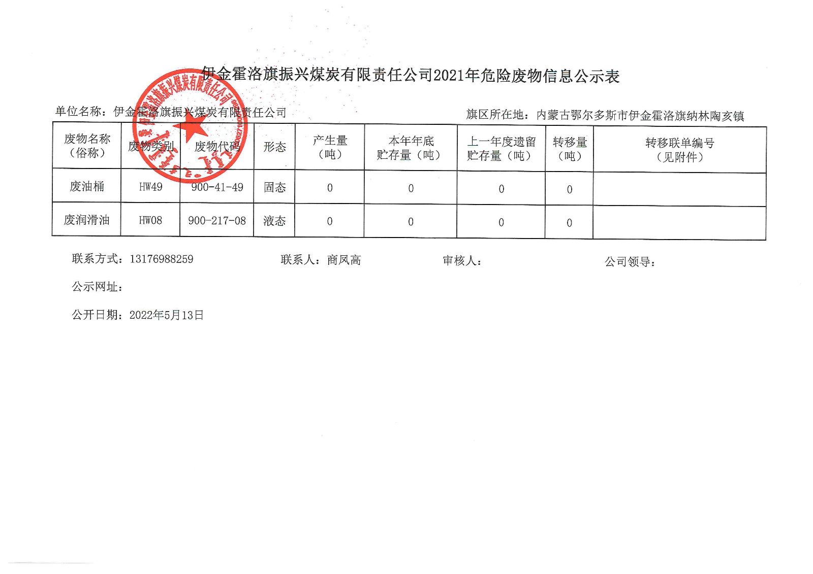 2021年伊金霍洛旗振興煤炭有限責任公司危險廢物公示